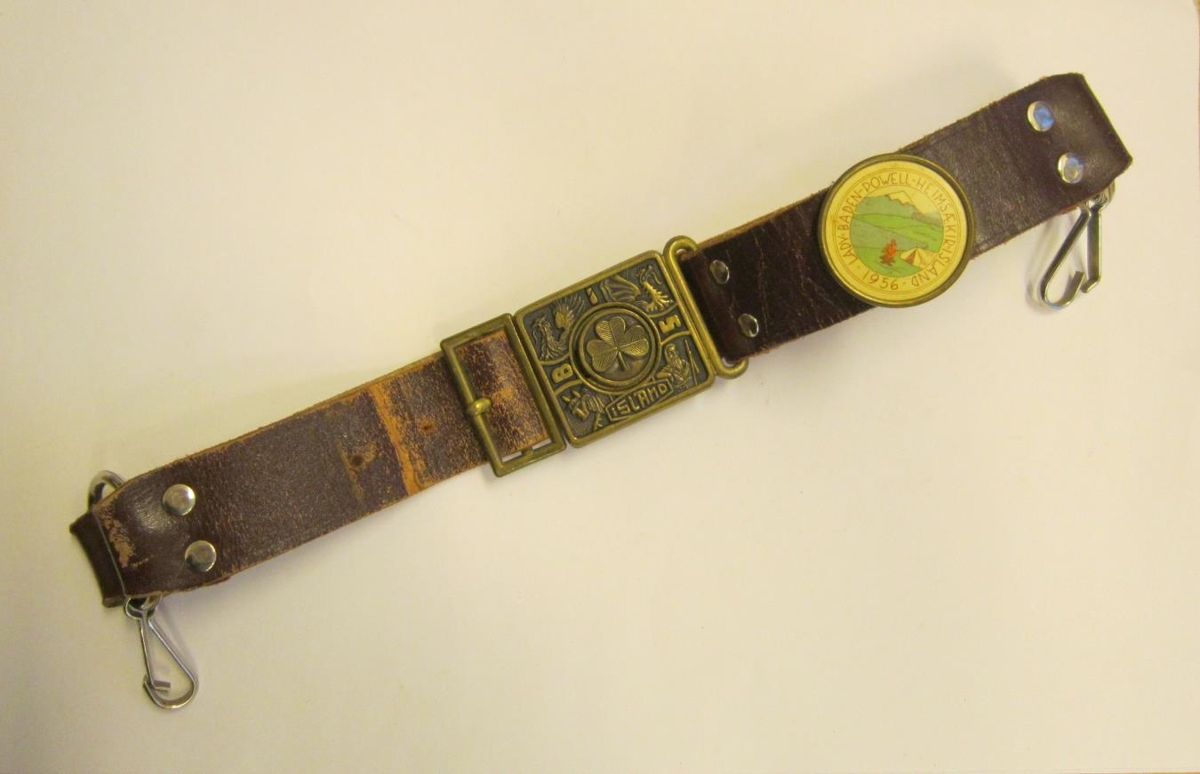 Belti af skátabúningi með áfestu merki frá heimsókn Lady Baden Powell 1956. Landsmót skáta var haldið það ár í Hagavík sem er suð-vestan við Þingvallavatn. Á beltissylgjunni eru upphleyptar myndir af landvættunum og stafirnir BÍS (Bandalag íslenskra skáta).