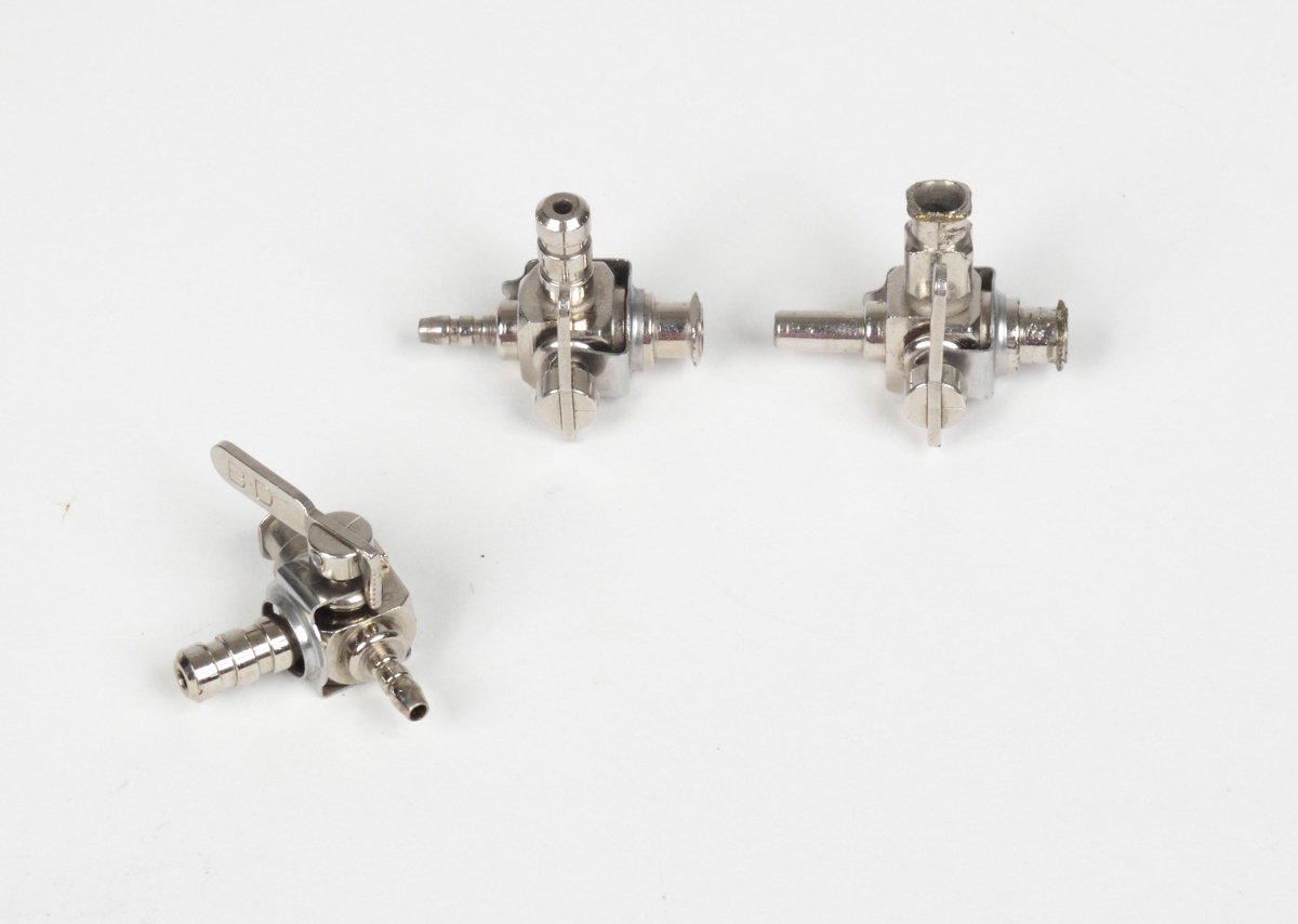Krani, notaður sem tengiliður, 3 stk. Þrír stútar eru á krananum fyrir slöngur og nálar. Ofan á er hægt að skrúfa fyrir og frá.