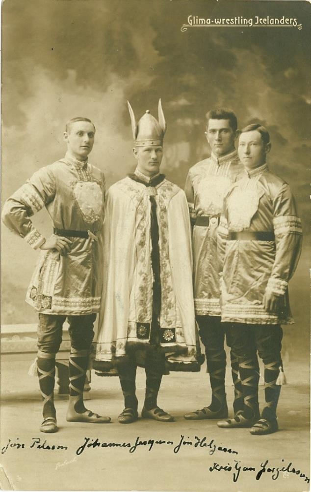 Fjórir menn klæddir í hempur með bryddingum og einn með skikkju og kórónu. Allir í hnébuxum og í léttum leðurskóm sem bundnir eru upp með þven. Á myndina er greypt „Glima wrestling Icelanders.“ Fjögur nöfn eru skrifuð með penna Jón Pálsson, Jóhannes Jósepsson, Jón Helgason og Kristján Þorgilsson.