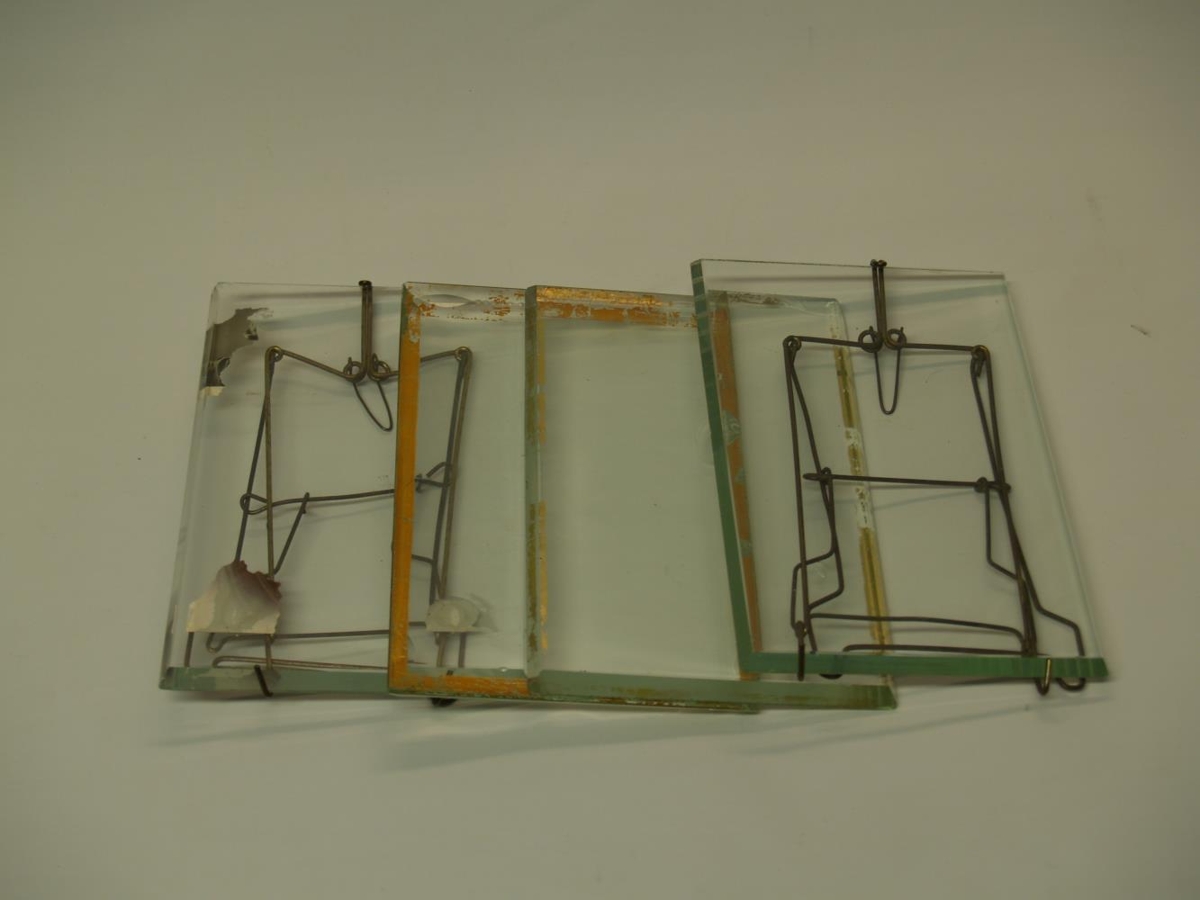 Fjórar glerplötur sem notaðar voru sem myndarammar. Á tveimur þeirra eru festingar úr vír til að halda römmunum uppréttum. Úr fórum Jóhannesar Kristjánssonar föðurbróður gefanda.