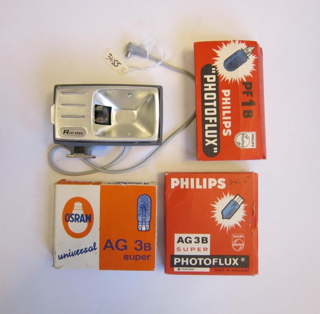 Flash og perur. Flashið (leifturljósið) er af gerðinni Ricoh Lite III, Flashgun, perurnar af gerðinni Osram og Philips í stærðum 1B og 3B.
