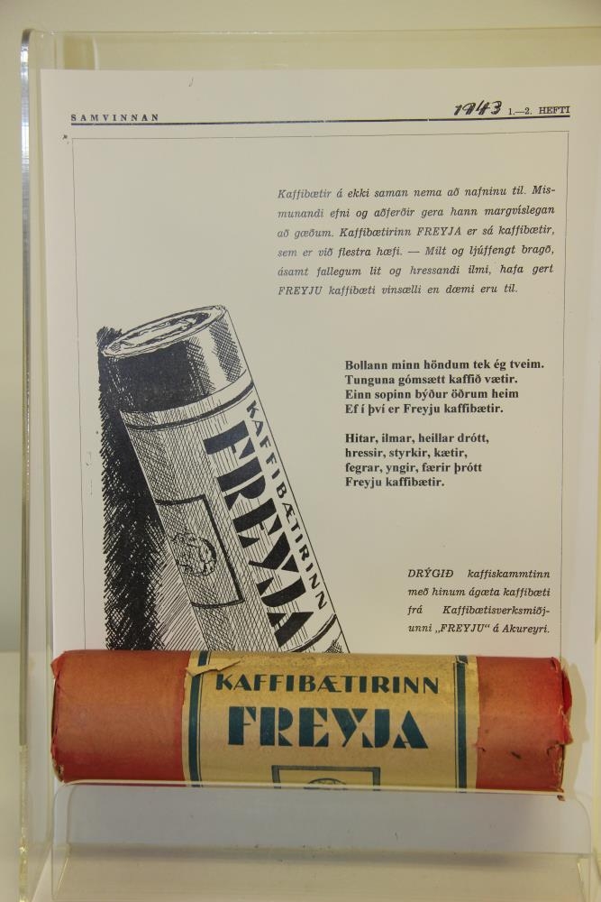 Pakki sem inniheldur kaffibæti sem notaður var til að spara kaffið. Pakkinn er rauður (upplitaður með álímdum miða um hann miðjan sem á er prentað: „Kaffibætirinn Freyja“. Mynd af aldraðri konu á peysufötum að drekka kaffi (vörumerkið). Auglýsing fyrir ágæti vörunnar í texta. Samband Íslenskra samvinnufélaga. Á endum eru álímdir miðar sem á er prentað: Freyju kaffibætir SÍS og teikning af kaffikönnu.
