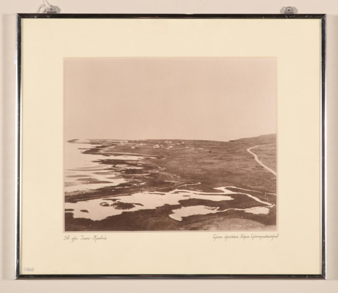Innrömmuð svart-hvít ljósmynd „Séð yfir Innri-Njarðvík“. Ljósmyndari óþekktur. Kópía frá Ljósmyndasafni Reykjavíkur. Myndin er í stálramma