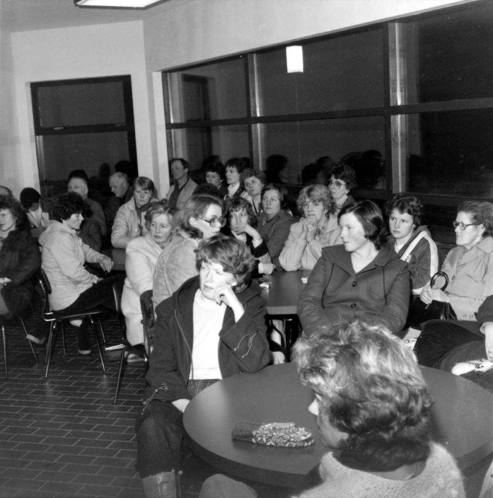 Björg Sigurbjörnsdóttir fremst, Valgerður Jónssdóttir frá Skarði í hvítri kápu, Hrafnhildur Áskelsdóttir við gluggan við hlið fullorðinnar konu með gleraugu.