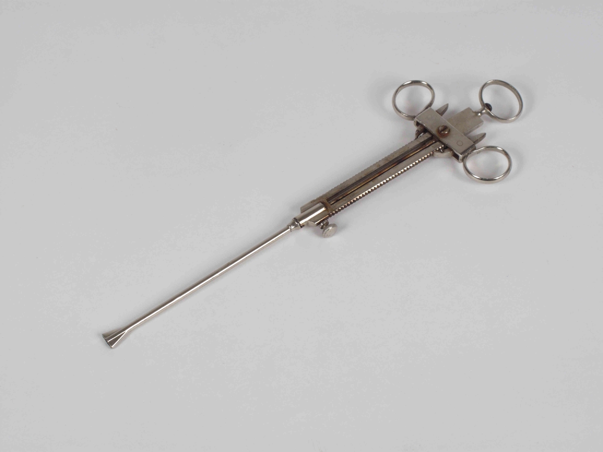 Hálskirtlasnara. Notuð við kirtlatöku. Fremst er langur stútur. Down´s 21 edition bls: L110, L663.