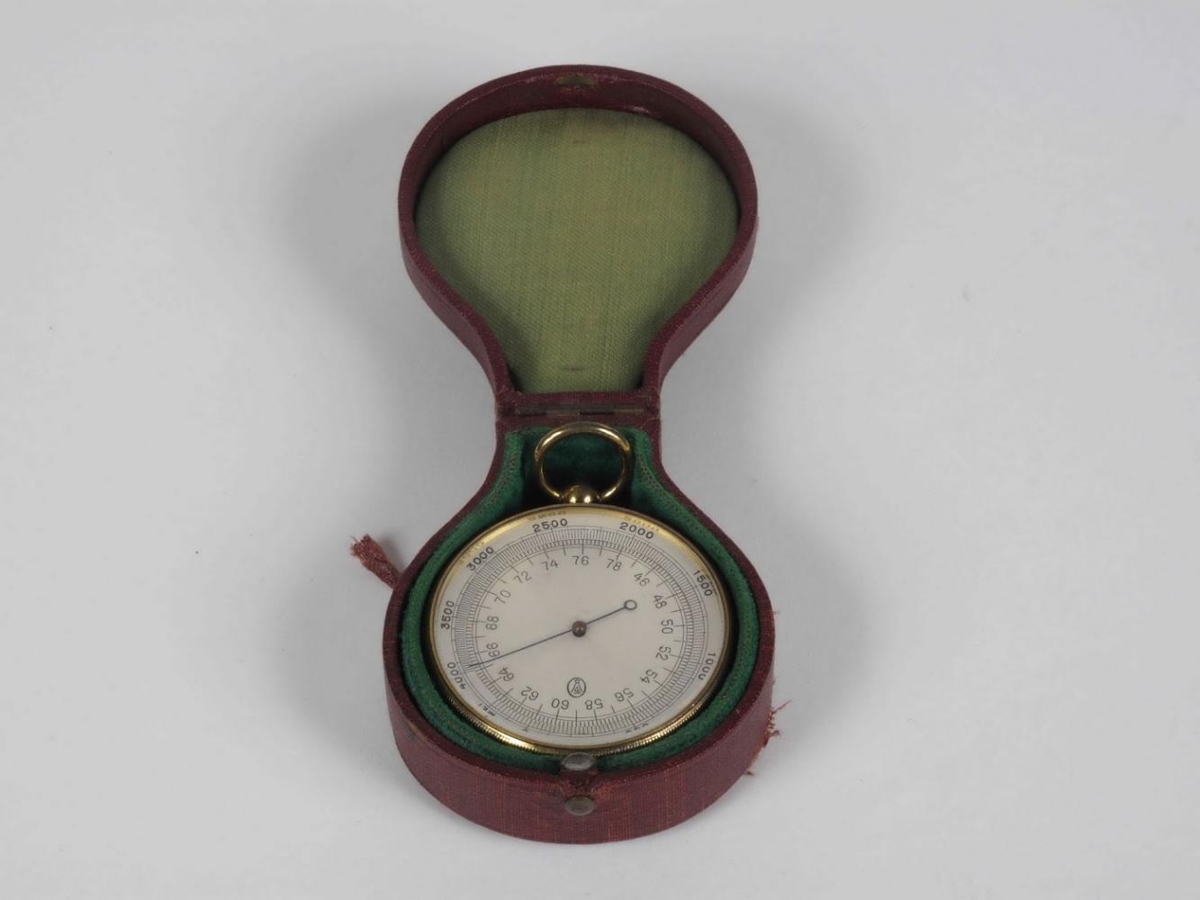 Loftþrýstingsmælir. Lítill loftþrýstingsmælir í viðarboxi, fóðruðu með grænu efni.
