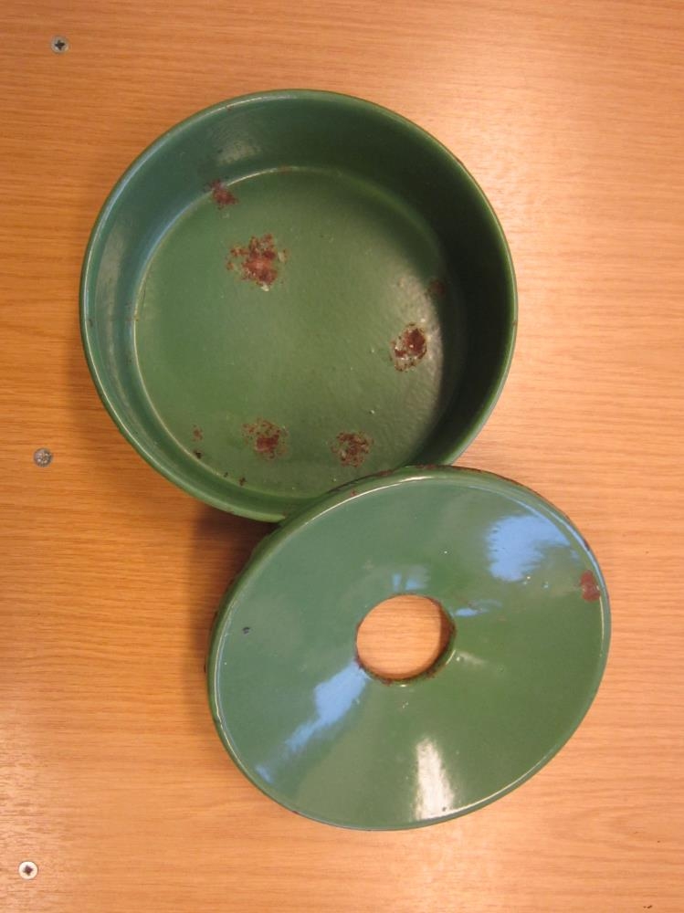 Spýtubakki úr járni, lakkaður grænn, þvermál 18 cm. Miðja loksins gengur niður og er með gati. Stefana G. K. átti gamla húsið á Þorgautsstöðum, safnið fékk nokkuð af gripum þaðan þegar það var selt. Munirnir eru frá fósturföður eiginmanns hennar, Guðmundi Jónssyni bónda á Þorgautsstöðum.