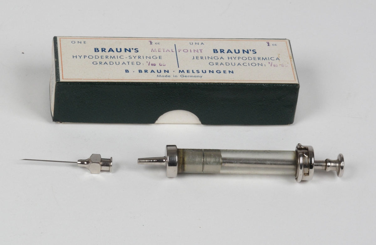 Kassi með sprautu. Í kassanum er 1 stk. sprauta 1 stk. sprautunál.