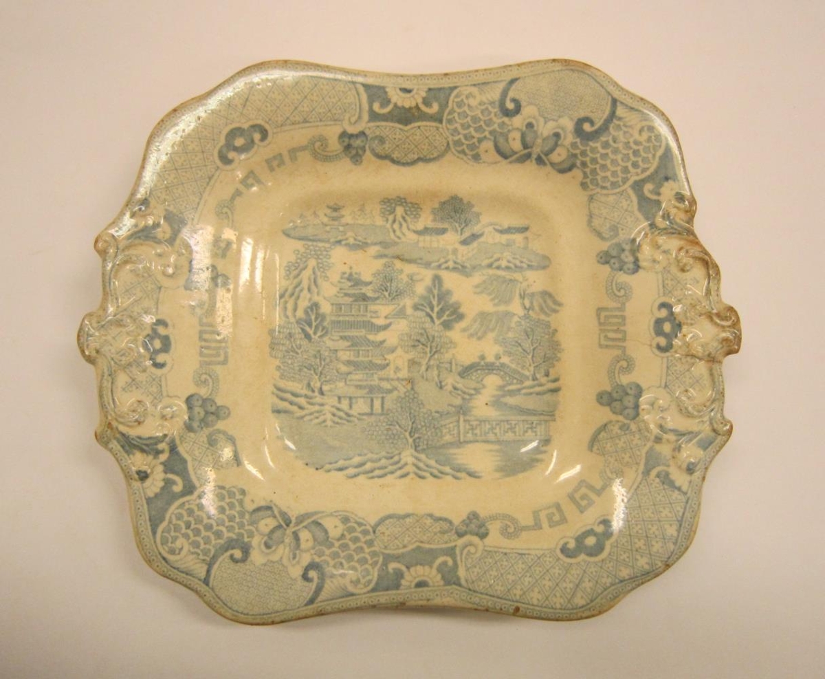 Skál úr leir, grunn, köntuð 25,5 x 21,5 cm. Skálin er ljós skreytt með ljóbláu, austurlensk mynd í botni.