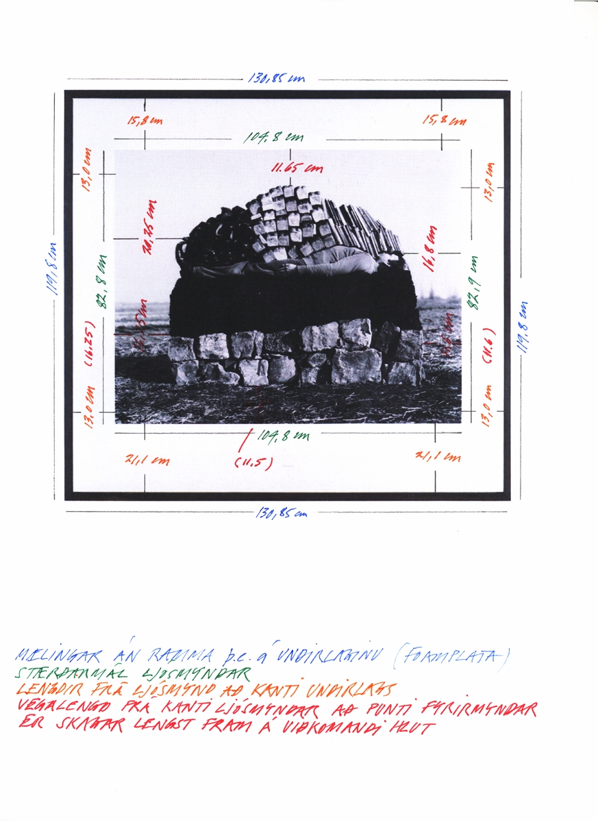 Mountain was Sigurður Guðmundsson’s final work in a photographic series, Situations, produced in 1971–1982. The photographs are planned performance art, or living sculptures, in black/white or colour – usually when the work is directly based on colour-usage – in which the artist plays the leading role more often than not. Mountain is undeniably reminiscent of a living sculpture, chiselled by the photograph that makes it permanent. The artist himself is central to the work, an intersection of nature and culture, and of course the layering, along vertical and horizontal axes, demonstrates a sort of process from a more natural foundation to man who has created a cultural artifact: rock, turf, man and culture, and as an idea it is expressed through the language which the title conveys. The man is both reason and basis for which the mountain exists as an idea and a form, so it is the fabrication of the man, and without him the mountain would not exist, no more than art itself. RP