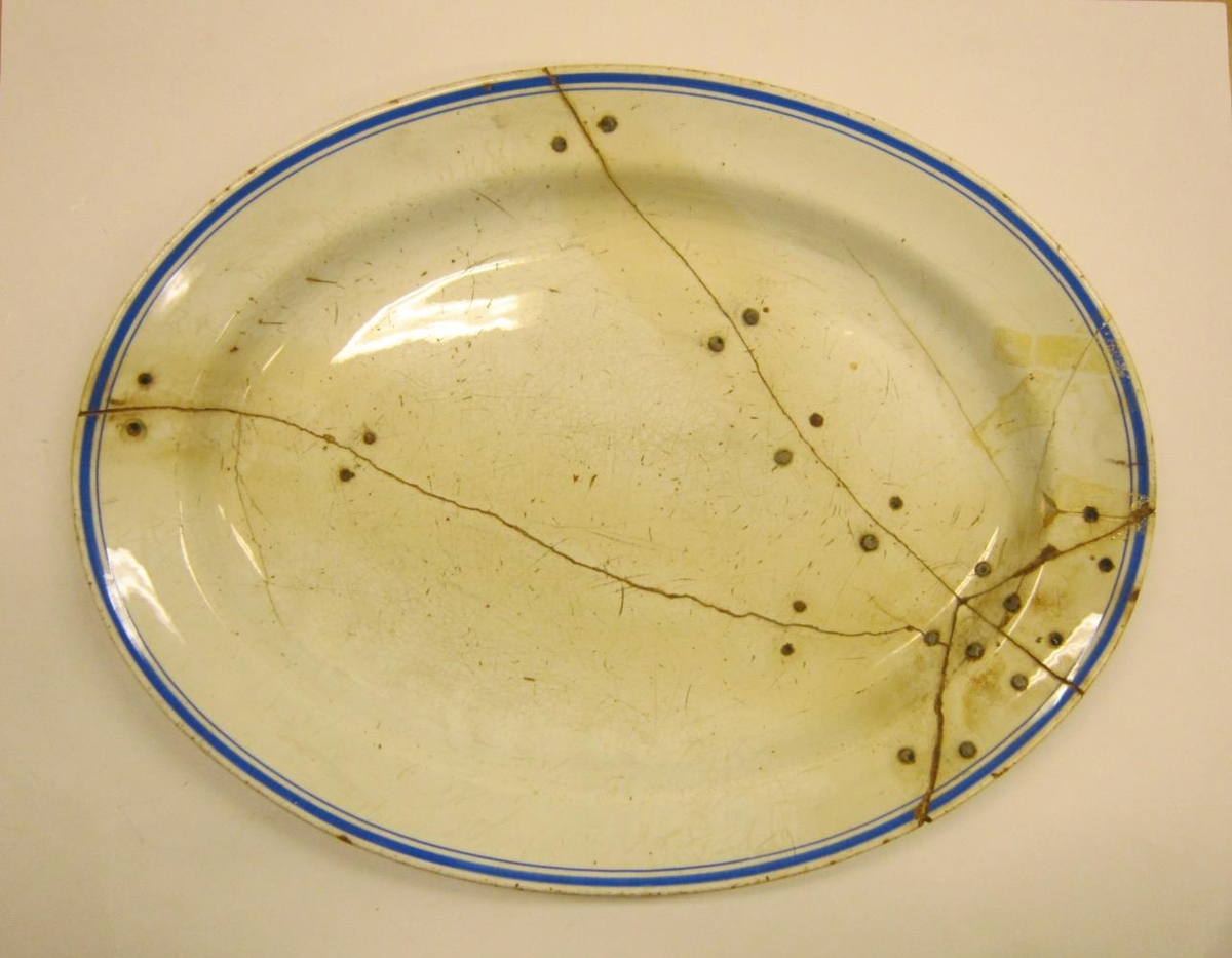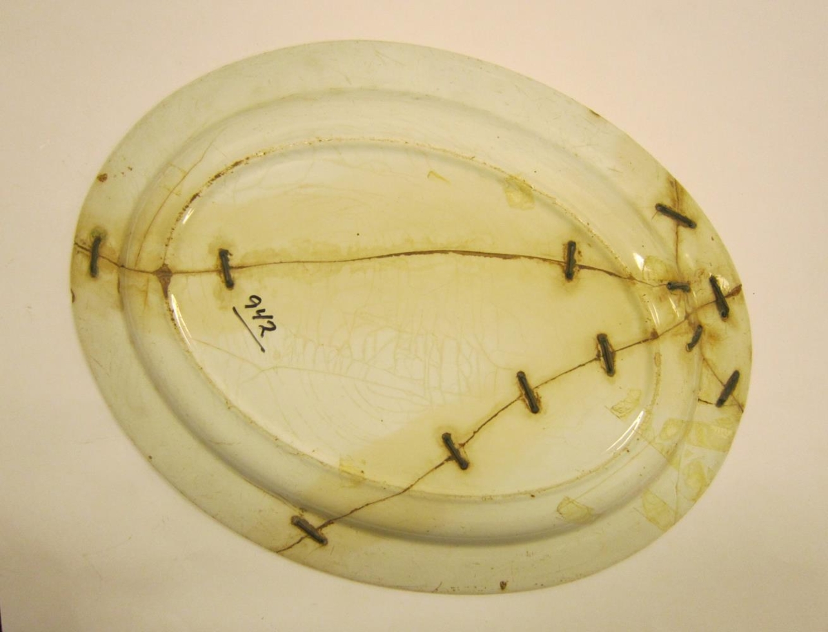 Steikarfat úr sama stelli og nr. 941, hvítt með blárri rönd. Fatið er brotið og spengt, handbragð Jóns Samúelssonar frá Hofsstöðum í Álftaneshreppi. Stærð 36,5 x 28 cm.