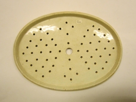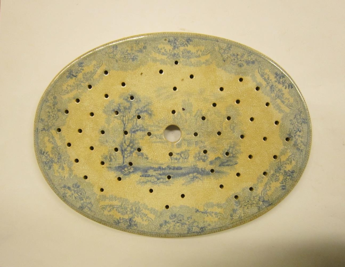 Fat, sporöskjulagað, ljóst öðru megin en blámunstrað á hinu megin, stærð 33 x 24 cm. Þetta fat er mjög sérstakt, á því eru 61 göt og barmur á ljósu hliðinni. Hægt að hugsa sér að það stæði í öðru fati og safi úr steikinni sigi niður í það. Hin hliðin, sem er alveg slétt með ljósbláu munstri, nýtist á sama hátt, eða gæti verið hlífðarbakki á borð fyrir heit föt. Snilldarútfærsla sem skrásetjari gæti hugsað sér að nota.
