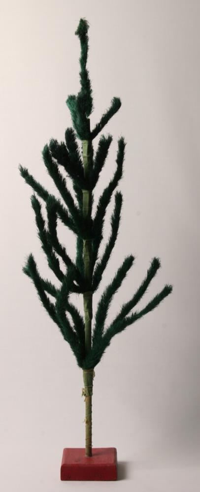 Jólatré, fannst inni í vegg í Ásabyggð 16. Tréið stendur á rauðum ferkönntuðum fæti.