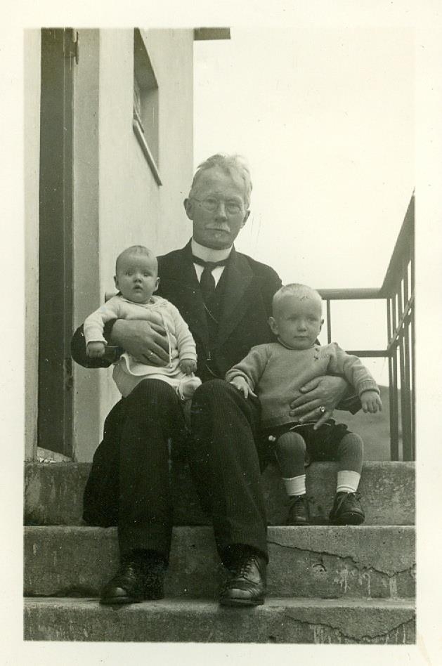 Jón Helgason situr á tröppum með tvö börn hjá sér, að öllum líkindum barnabörn sín, Marta María Hálfdánardóttir (vinstra megin) og Jón Helgi Hálfdánarson (hægra megin).