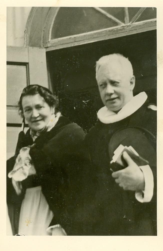 Hjónin Lára Skúladóttir Norðdhals og Hálfdán Helgason ganga út um kirkjudyr.