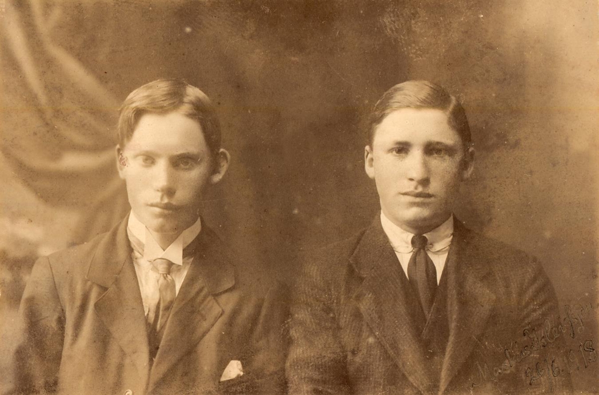 Á myndinni er Markús ásamt Guðna Ísleifssyni. Markús sendi Ömmu sinni myndina, en ömmu sína kallar hann ömmu Vigfúsdóttur.