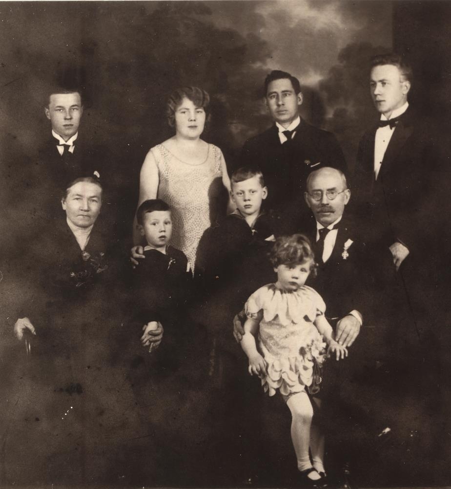 Standandi talið frá vinstri er Eggert Ólafsson (1909-1998), Ingveldur Ólafsdóttir (Inga Loftsson) (1901-1995), maður hennar Loftur Loftsson útgerðamaður og kaupmaður (1884-1960) og svo Huxley Ólafsson (1905-2000).