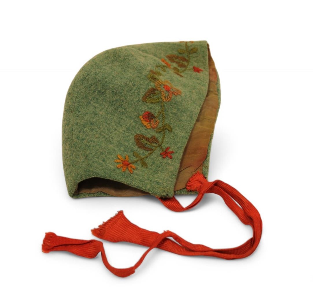 Saumuð, líklegast heimasaumuð barnahúfa úr grænu ullarefni fóðruð með gráu satínefni. Rauð ofin bönd. Útsaumur, blóm og blöð, á húfunni.