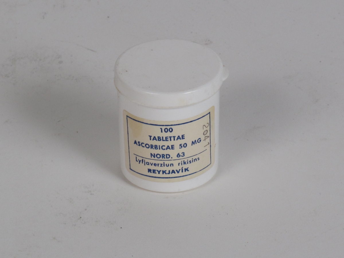 Hvítt plastbox (tómt). Merking: 100 tablettae / Ascorbicae 50 mg. / Nord. 63.