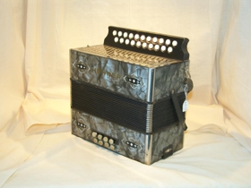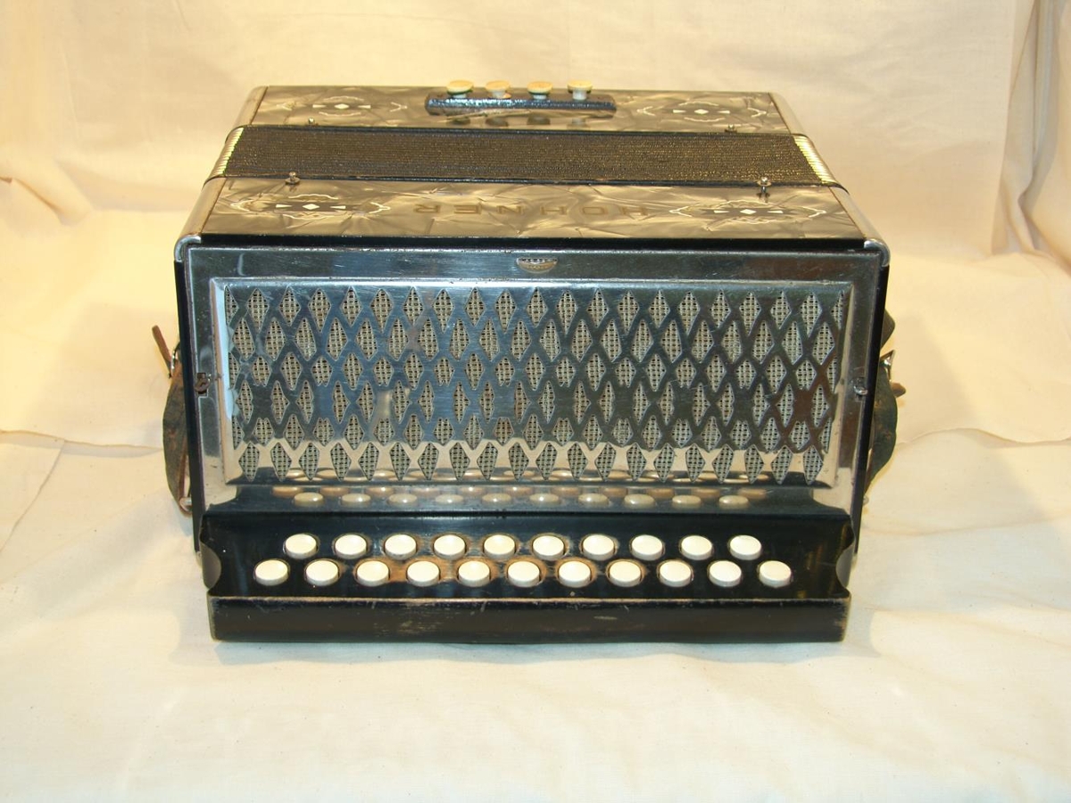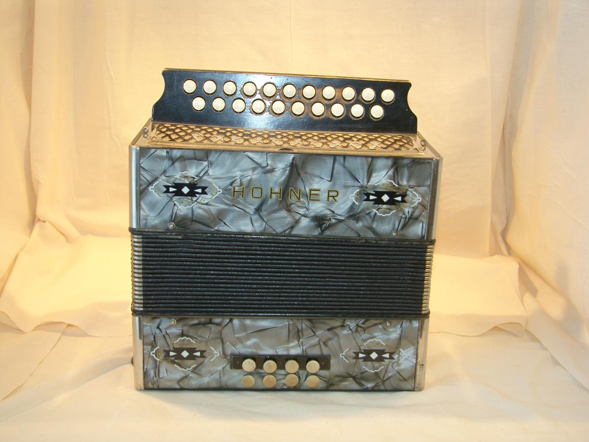 Grá 2 raða díatónísk hnappaharmonika af gerðinni HOHNER, 21 nóta í diskant og 8 í bassa. Framleidd í Þýskalandi. Harmonikan kom í viðgerð til Jóhannesar Jóhannessonar árið 1944. Eigandi hennar þá var skipstjóri frá Vestfjörðum sem flutti til Reykjavíkur. Að beiðni eigandans seldi Jóhannes harmonikuna til greiðslu á viðgerðinni. Gefandi keypti harmonikuna og gaf föður sínum, Jóni Guðbrandssyni, bónda á Saurbæ, en hann hafði spilað á harmoniku áður. Eftir lát Jóns fór harmonikan á flakk, en fannst fyrir tilviljun í Reykjavík nú fyrir skömmu.