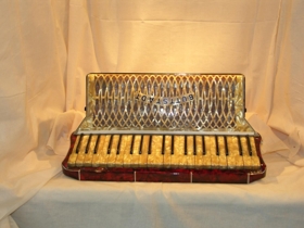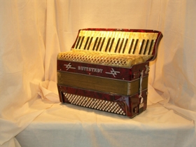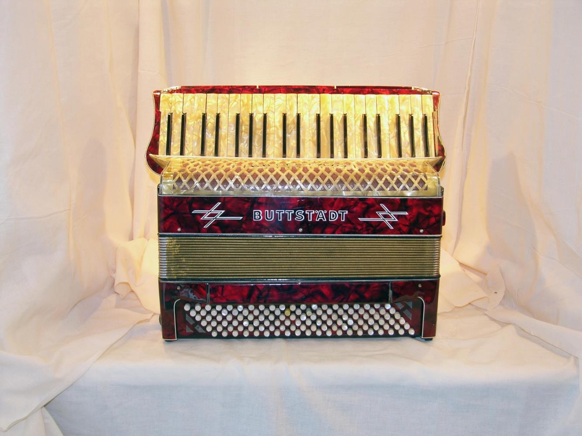 Rauð píanóharmonika af gerðinni BÜTTSTADT, 41 nóta í diskant og 120 í bassa 4 kóra og 3 skiptingar.