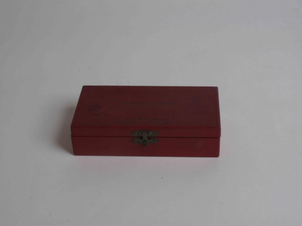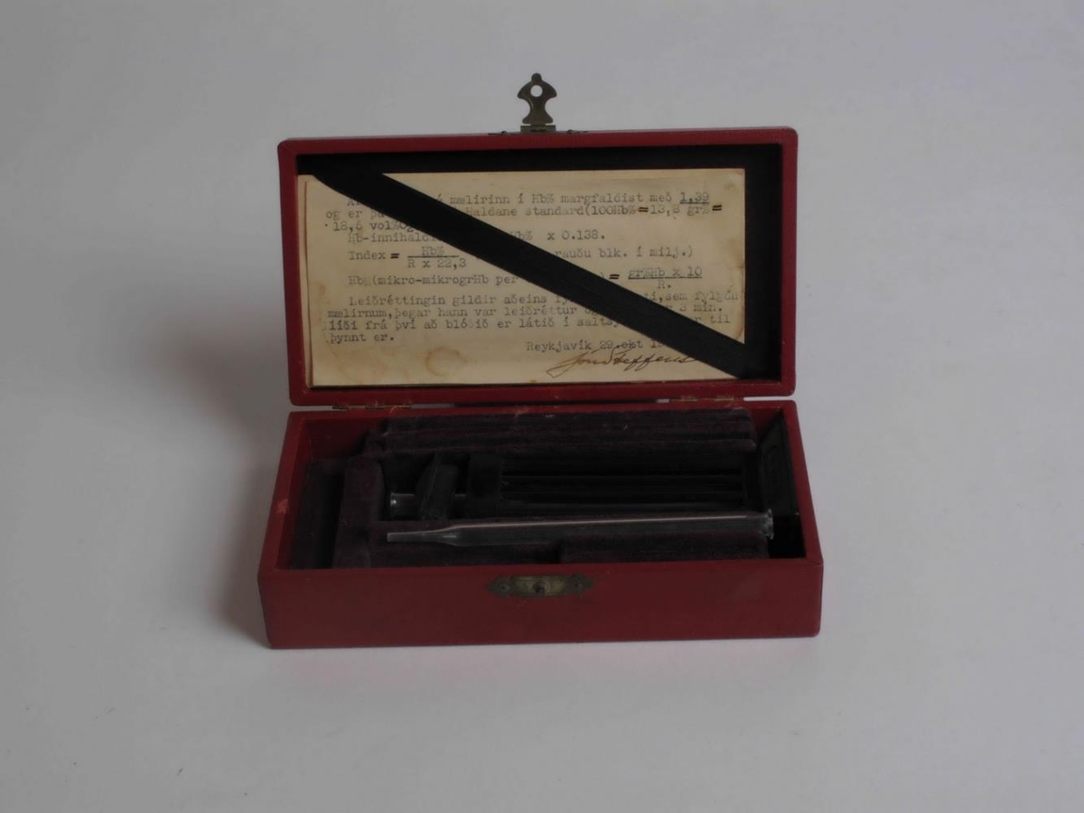 Blóðkornamælir. Rauður kassi lengd 17,5 cm , breidd 9,2 cm og hæð 4,5 cm. Í kassanum plastpípa, pípustandur með pípu, á pípunni eru mælieiningar fyrir ml.
