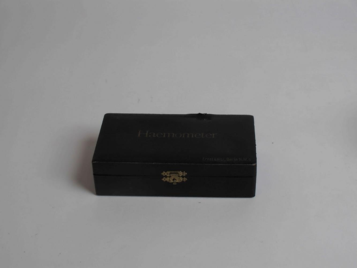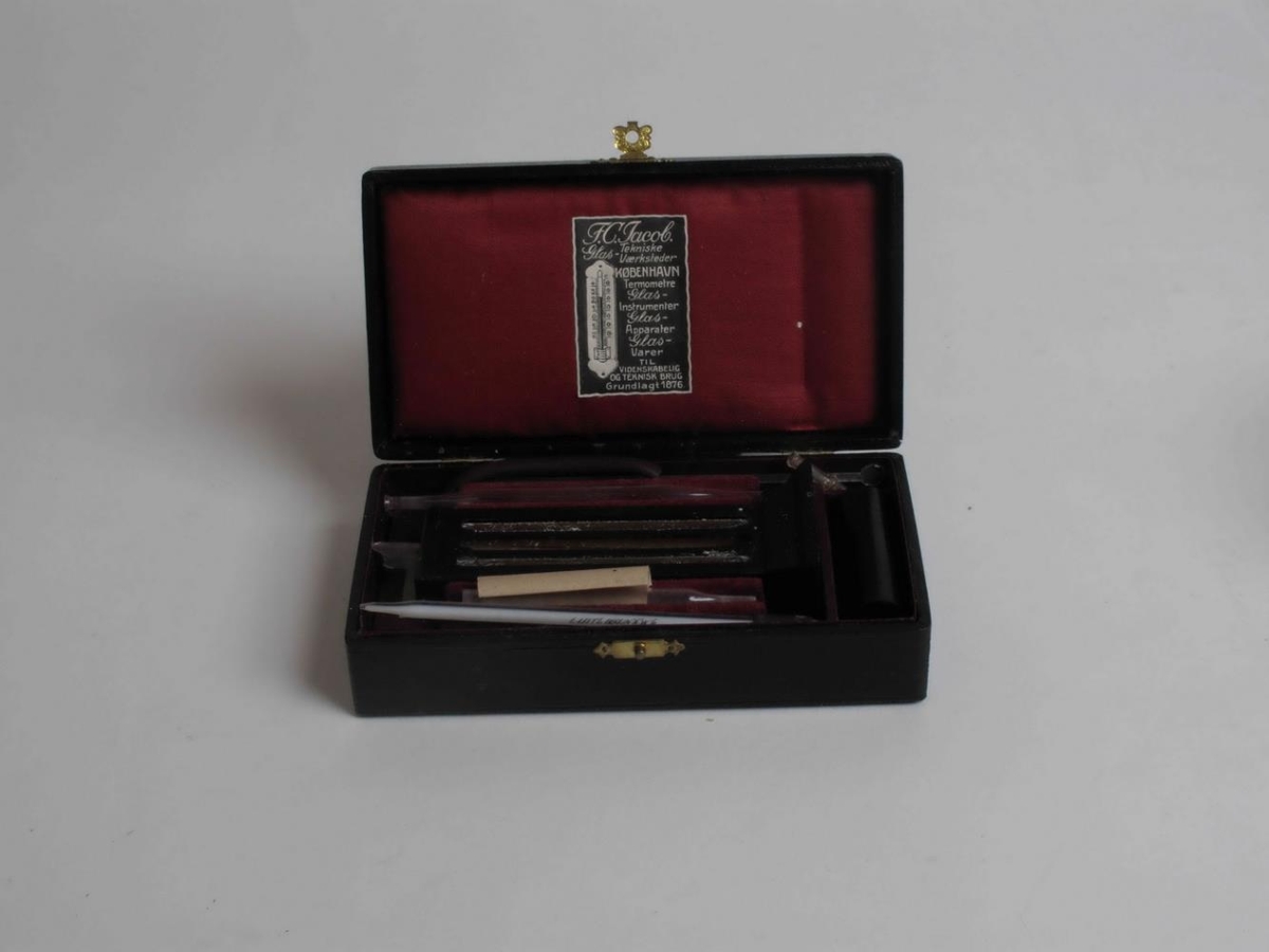 Blóðkornamælir. Svartur kassi, þrjú glerrör í hólk ásamt fylgihlutum.