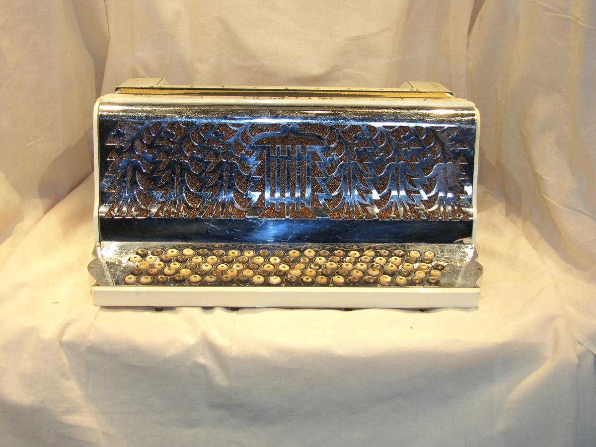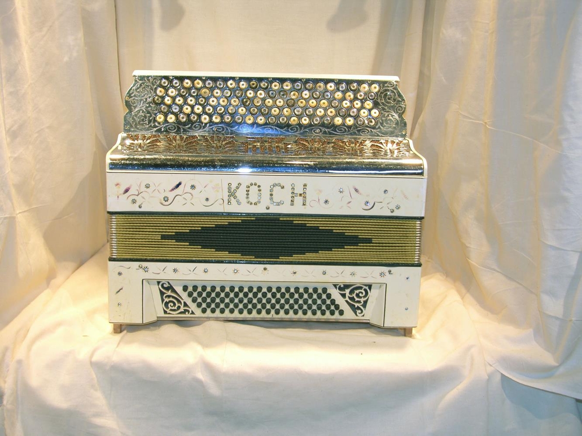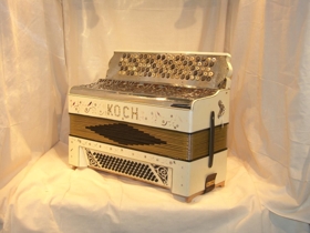 Hvít 5 raða hnappaharmonika af gerðinni KOCH, 100 nótur í diskant og 80 í bassa, 5 kóra og 1 skipting. Framleidd á Ítalíu. Búið er að setja nýjan belg o.fl. Á grillið er grafið "M.Sigurðsson". Kristinn Leví Jónsson smiður á Ísafirði keypti harmonikuna notaða árið 1940 af Ragnari Maríussyni.