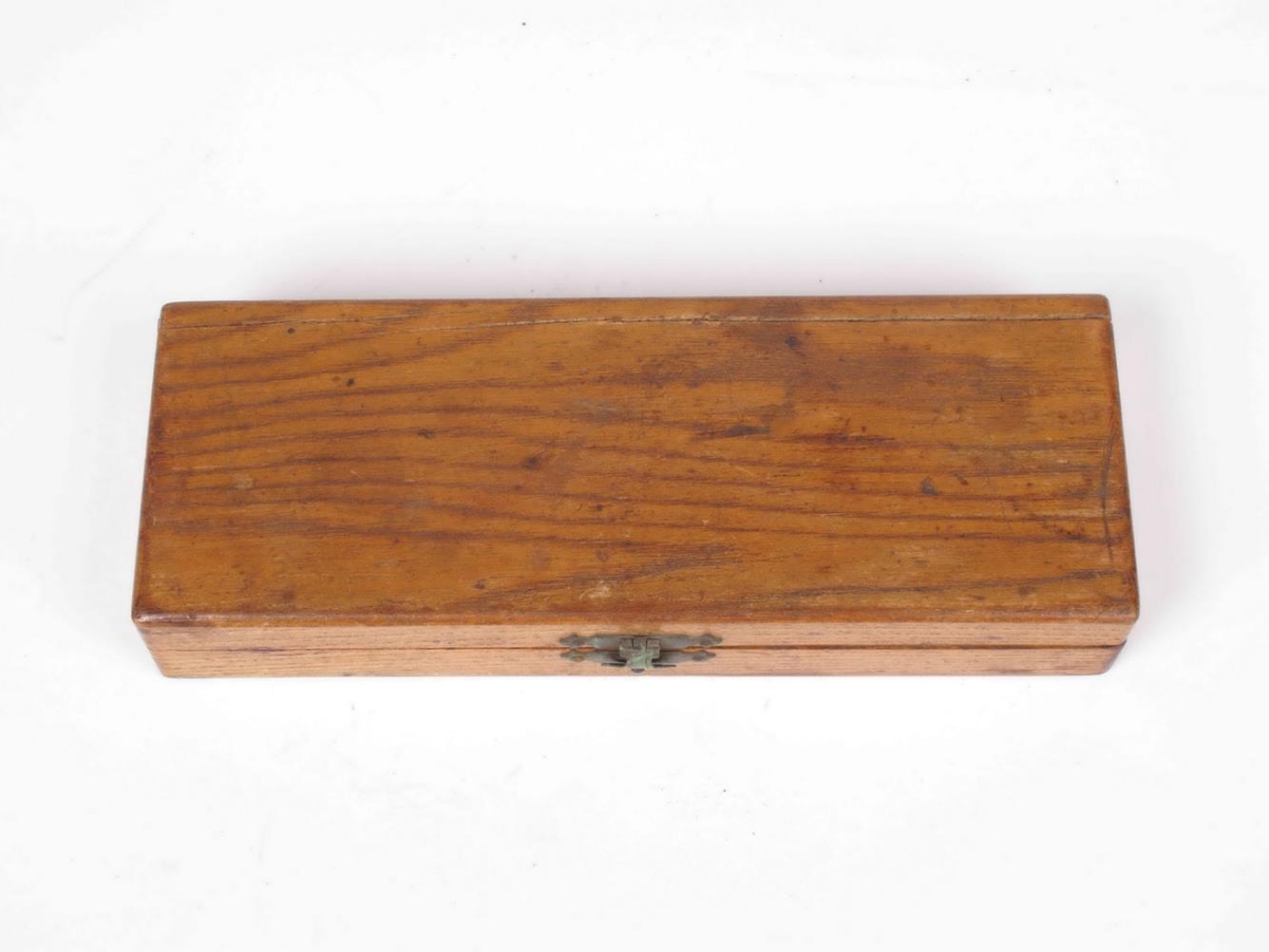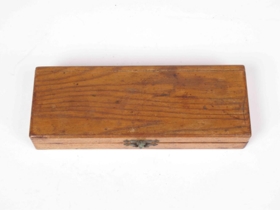 Skurðáhaldakassi. Viðarkassi með loki á lömum og krækju. Í loki gerð ráð fyrir skærum/töng. Í kassanum gripir fyrir 3 pinsettur/klíputangir og aukahólf. Í kassanum eru 3 klíputangir NS 5802-5804, 1 kanni NS 5805, 1 sárakanni NS 5806.