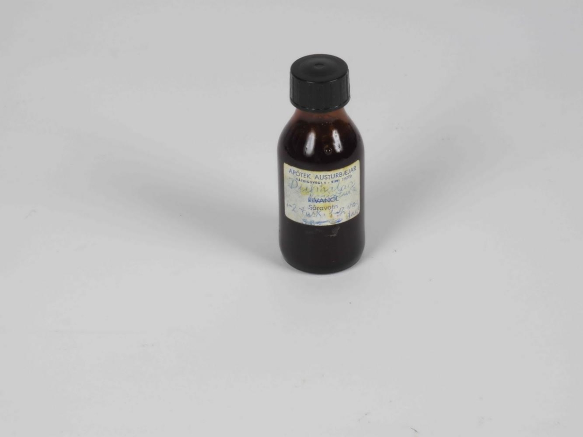 Brún flaska með Sáravatni. Stílað á Sigurveigu Jónsdóttur.