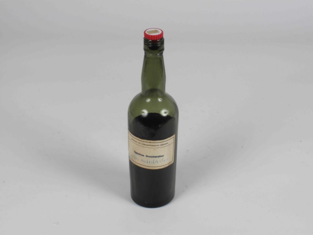 Græn flasa með hvítum miða og á honum stendur: Carbo Meticinatis.