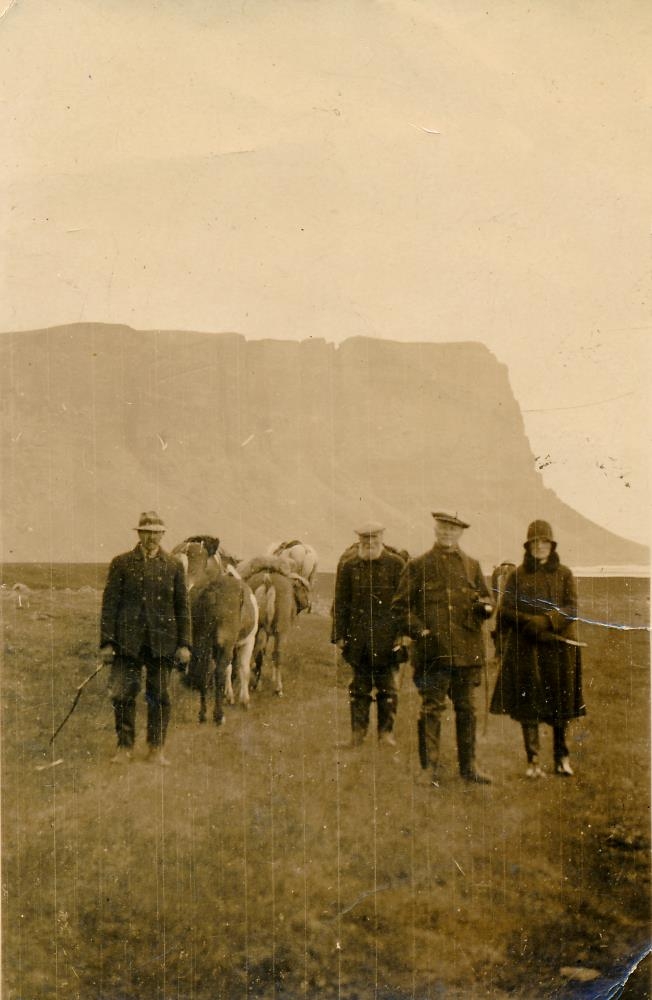 Gísli Sveinsson í þingferð. Í baksýn gnæfir Lómagnúpur. Á mynd eru Helgi í Núpum, Stefán Þorvaldsson, Gísli og Sigríður á Flögu.