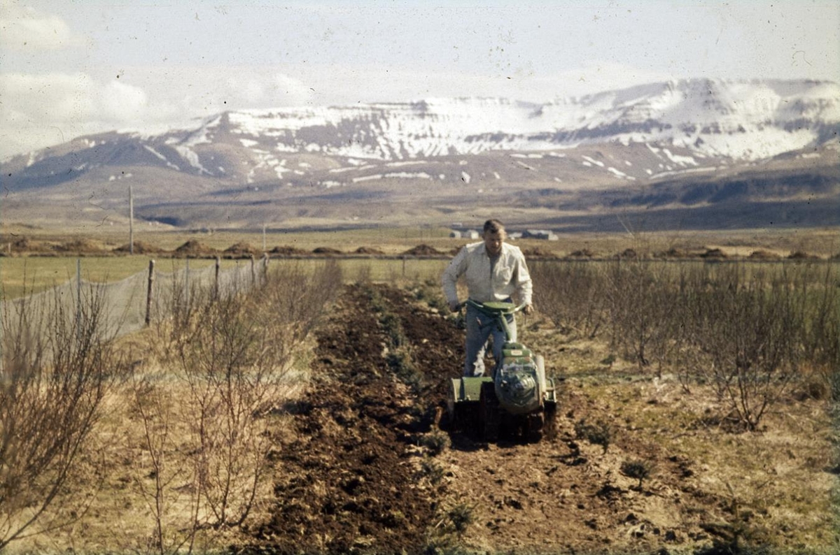 Illgresi hreinsað úr skjólbelti frá 1956 og 1957. Magnús Ellertsson með lítinn tætara.