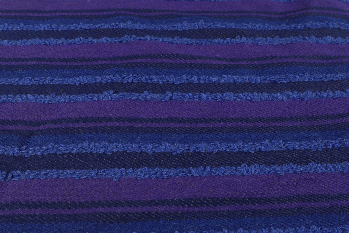 Röndótt áklæði, fjólublátt og blátt (þrír bláir litir). Ljósbláa bandið er ítalskt innflutt lykkjuband. Áklæðið er úr ull. Uppistaða er sterkur þunnur þráður.