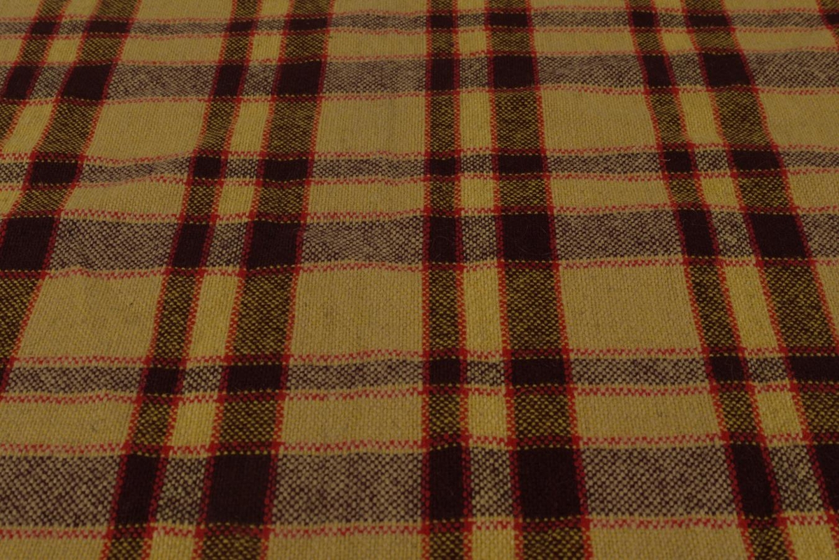 Köflótt efni, tiltölulega þunnt áklæði. Gult, rautt og vínrautt. Íslenskt band.