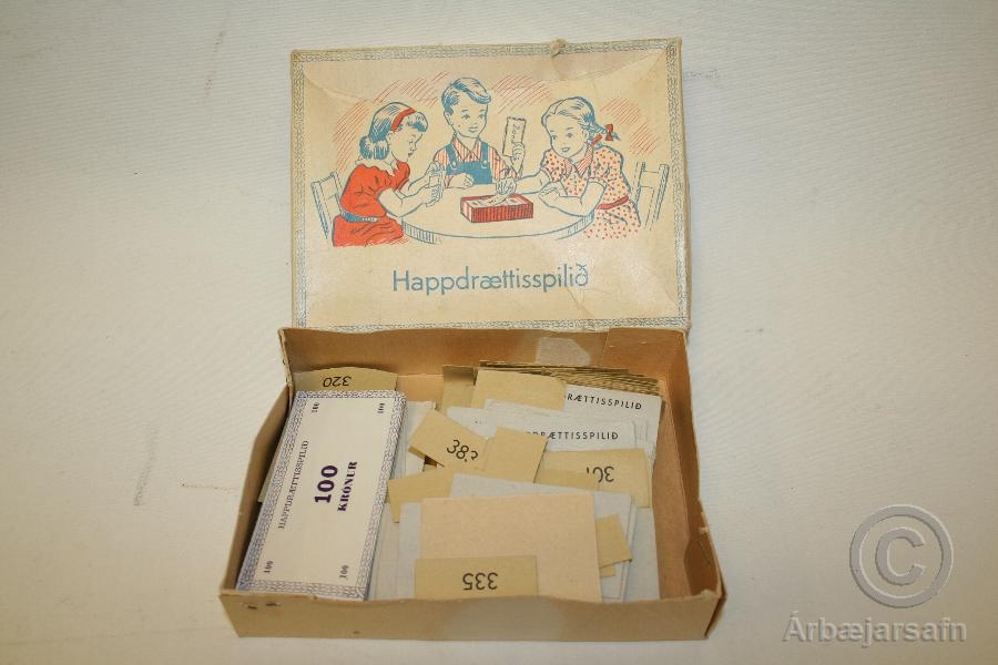 Happdrættisspilið. Pappaaskja með peningum og tvenns konar miðum með númerum. Uppruni óþekktur.
