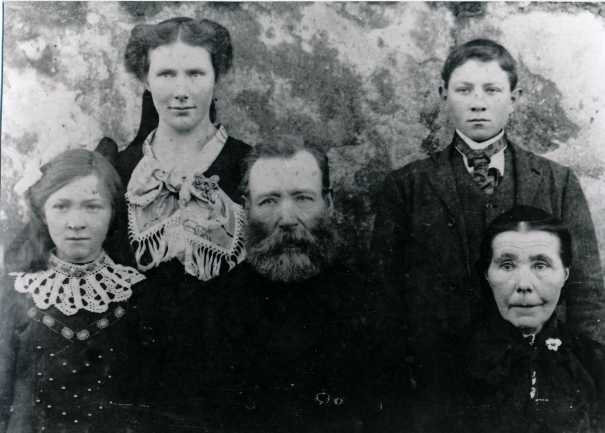 Hjónin Sigríður Einarsdóttir og Jón Jónsson í Reynishólum í Mýrdal ásamt dóttur sinni Þórunni og tveimur fósturbörnum Guðrúnu Jónasdóttur og Þorsteini Jakobssyni. Mynd tekin 1914.