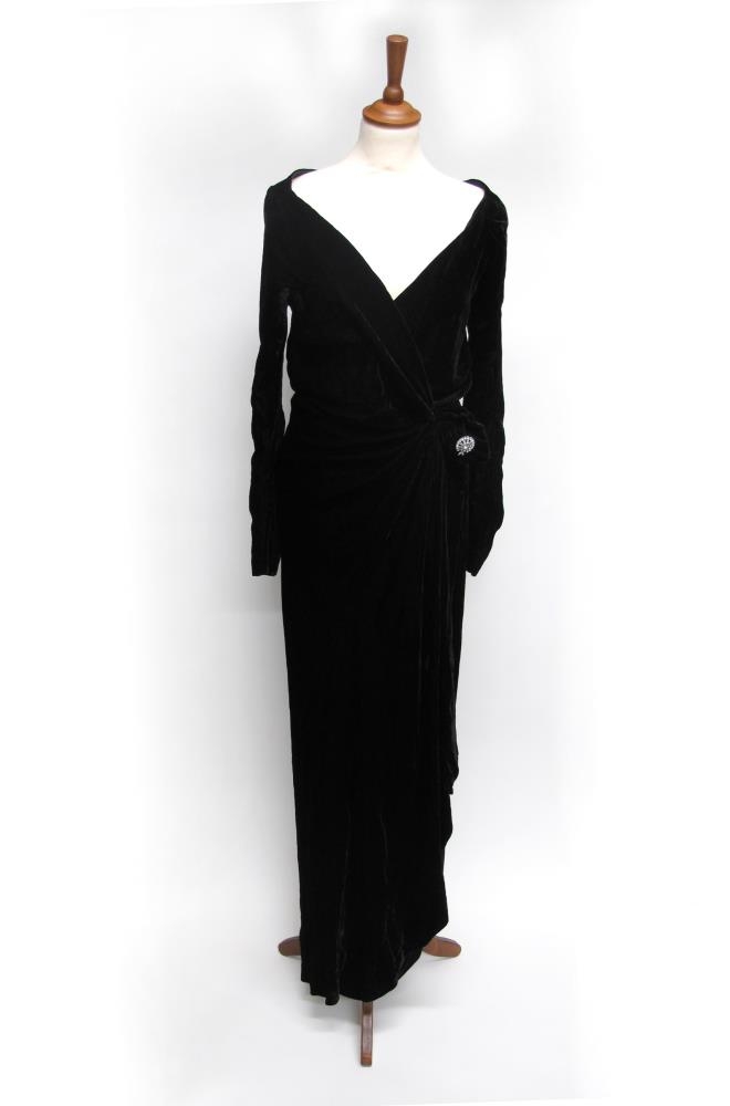 Síðkjóll úr svörtu silkiflaueli, með síðum ermum. Hann er opinn, en bundinn saman að framan og rykktur við vinstri mjöðm og þar í er fest næla með glærum skrautsteinum. Kjóllinn er fleginn um axlir og gengur í V að framan, við hálsmál. Kjóllinn er saumaður upp úr kápu sem fannst á öskuhaugum í Bandaríkjunum árið 1962. Að sögn gefanda þá „var kápan úr allt of fínu efni til að fleygja henni“. Gefandi, Guðrún Tómasdóttir söngkona, klæddist kjólnum á einsöngstónleikum í Gamla bíói í mars árið 1965. Það var vinkona Guðrúnar, Þóra Jónsdóttir frá Laxamýri, sem saumaði kjólinn upp úr kápunni. Eilítið er um saumsprettur og smávægileg göt við sauma á kjólnum en annars er hann í góðu ástandi.