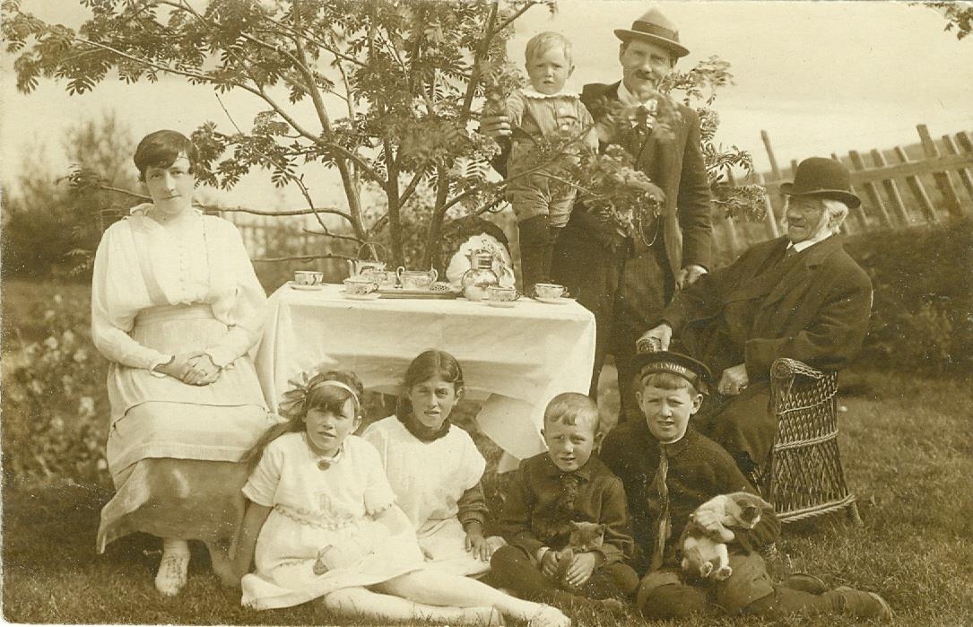 Fjölskylda situr úti í garði. Frá vinstri eru Kristín Katrín, Anna Guðrún, óþekkt stúlka, Þorvaldur, annar hvor tvíburinn Baldur eða Bragi með kött í fanginu. Matthías situr í baststól. Honum á hægri hönd stendur sonur hans Steingrímur með son sinn Þorvald standandi uppi á borði sér við hlið.