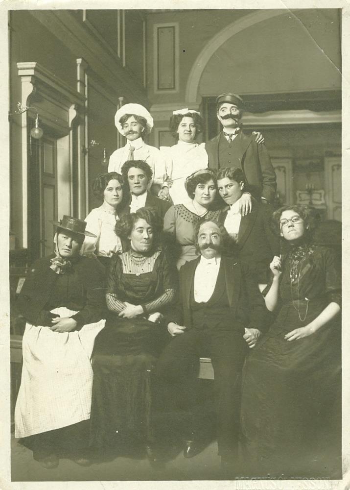 Ellefu konur í búningum, sumar í karlmannsfötum. Dætur Matthíasar Jochumssonar eru væntanlega á myndinni, líklega þrjár.