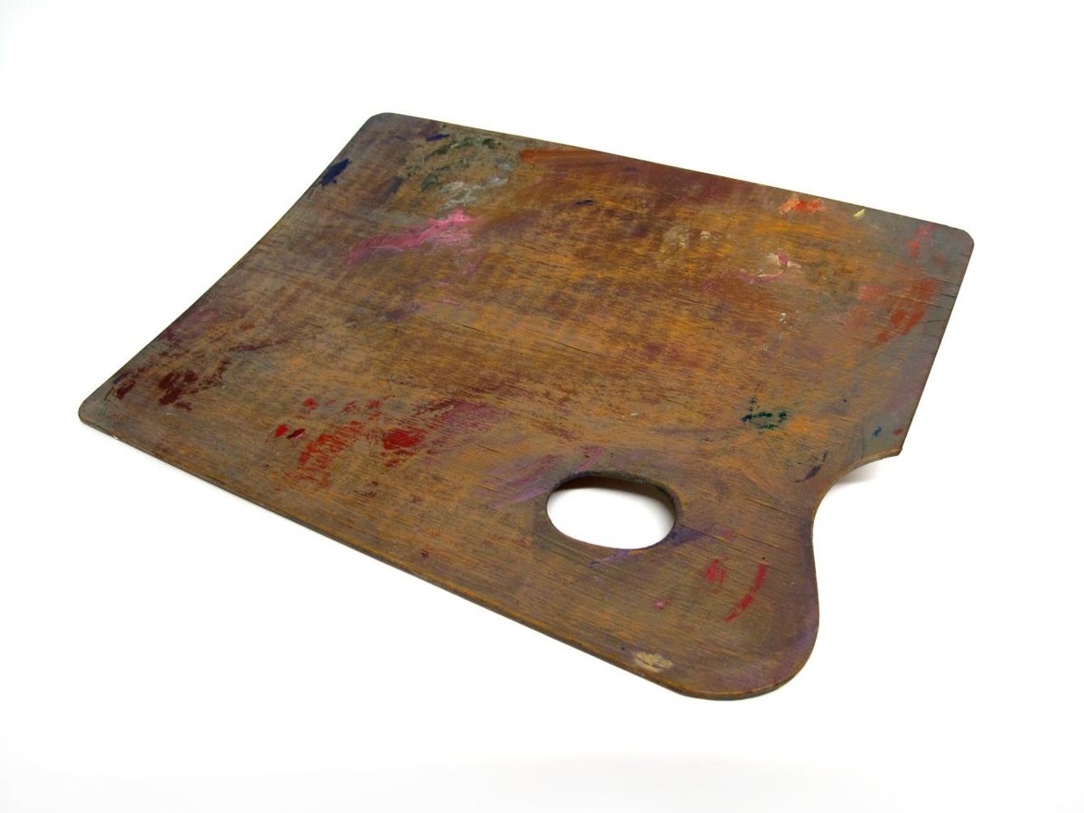 Málaraspjald ("paletta") úr eigu Muggs (Guðmundur Pétursson Thorsteinsson). Spjaldið, sem er úr harðviði, er því sem næst ferhyrnt, þó með rúnnuð horn og sveig við eitt hornið og gat þar hjá, þar sem haldið var á spjaldinu (eins og algengt er með málaraspjöld). Spjaldið virðist hafa verið all nokkuð notað en þó hefur málningin að miklu leyti verið þurrkuð jafn óðum af. Það er eilítið undið og í viðnum eru smávægilegar sprungur en annars er það í mjög góðu ástandi.