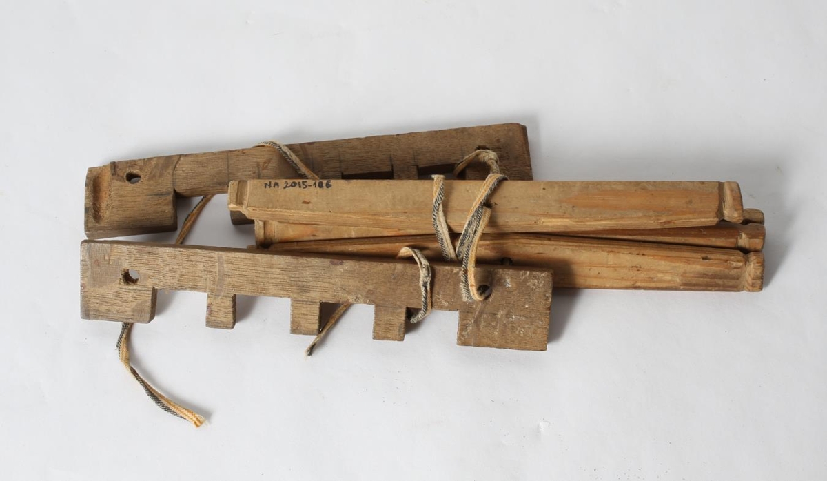 Tveir hafaldakambar og fjórar vippur sem notaðar voru við að setja upp í vefstól.