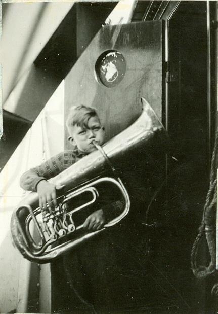 Strákur að blása í básúnu við dyragætt. Að öllum líkindum Einar Vigfússon.