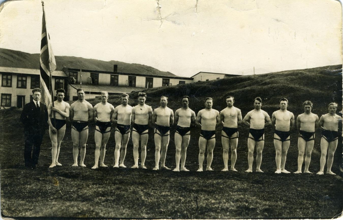 „Í Íþróttablaðinu, október 1926, má lesa grein eftir Helga Valtýsson um glímuförina til Danmerkur. Jón Þorsteinsson, íþróttakennari, og þjálfari glímumannanna er lengst til vinstri við hlið fánans.“ (GG 2024)