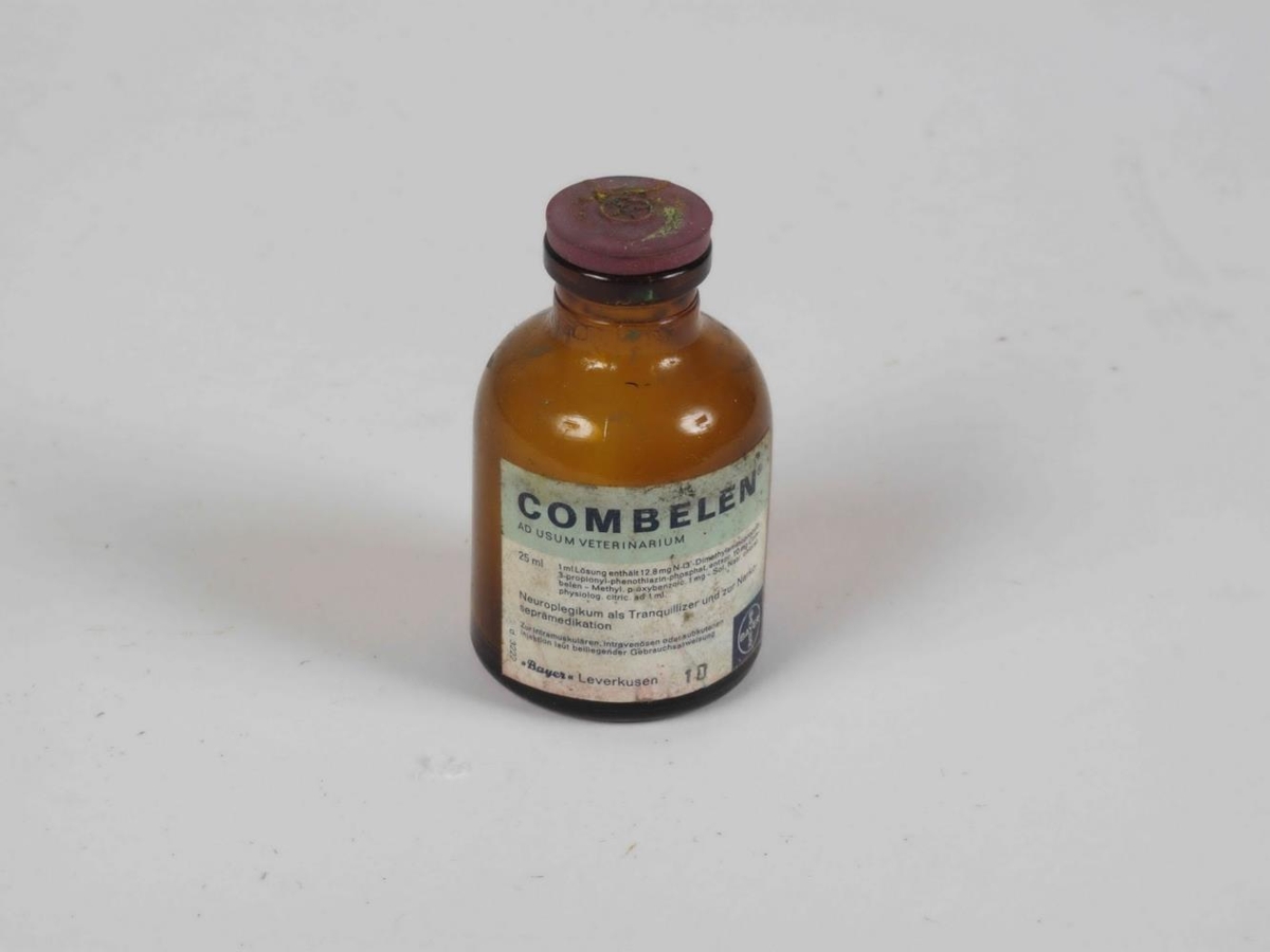 Brúnt lyfjaglas (tómt). Merking: Combelen / ad usum veterinarum.