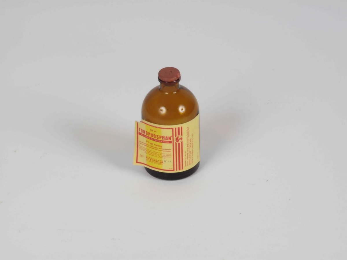 Brúnt lyfjaglas með gúmmítappa. Merking: Tonophosphan.