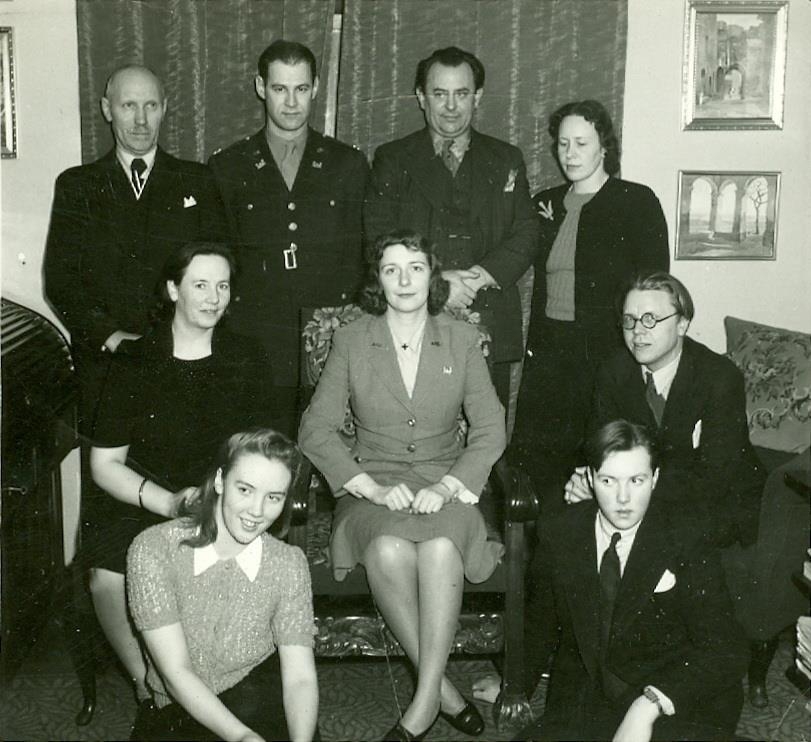 Hópur fólks uppstilltur í stofu í heimahúsi. Í efstu röð frá vinstri eru: Vigfús Einarsson, óþekktur hermaður, Páll Ísólfsson og óþekkt kona. Miðröð frá vinstri: Guðrún Sveinsdóttir, óþekkt kona og Árni Kristjánsson. Fremst sitja systkinin Herdís og Einar Vigfúsbörn.