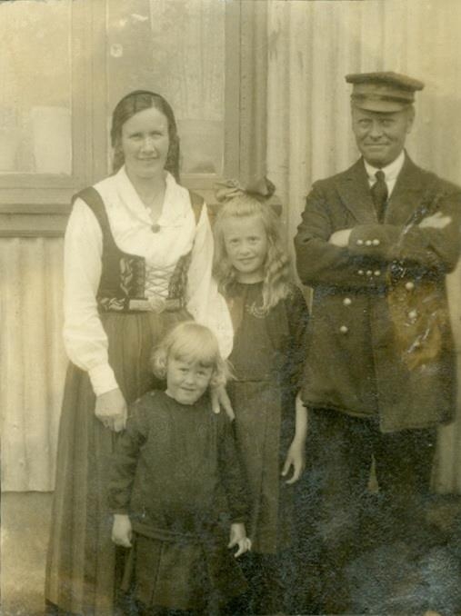 Hjón með tvær stúlkur standa upp við vegg. Guðrún lengst til vinstri framan við hana er Sigríður, þá Guðríður og lengst til hægri Gísli Sveinsson.