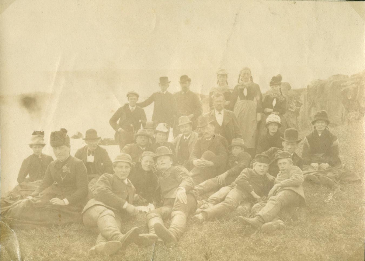 Uppstilltur hópur fólks úti við. Hendrik Schiöth situr á hnjám sér í jakka með hvítt skyrtubrjóst, skeggjaður hægra megin við miðja mynd.