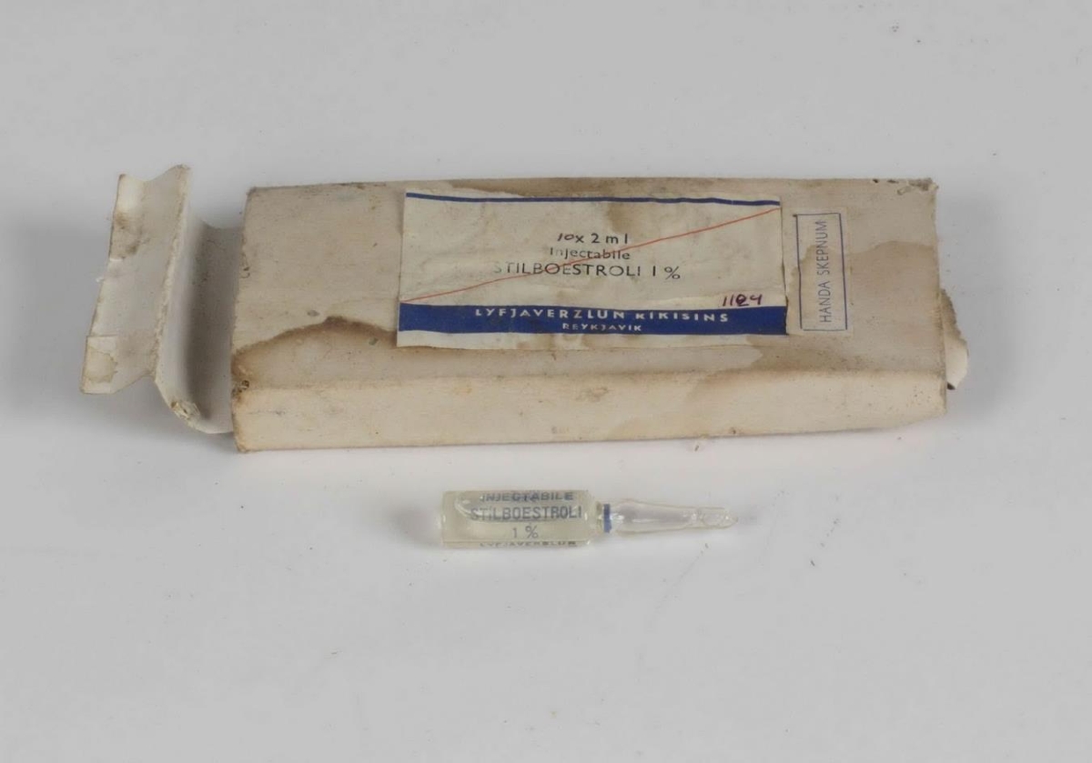 Glösin eru í kassa og á honum stendur: 10 x 2 ml / Injectabile / STILBOESTROLI 1 %.